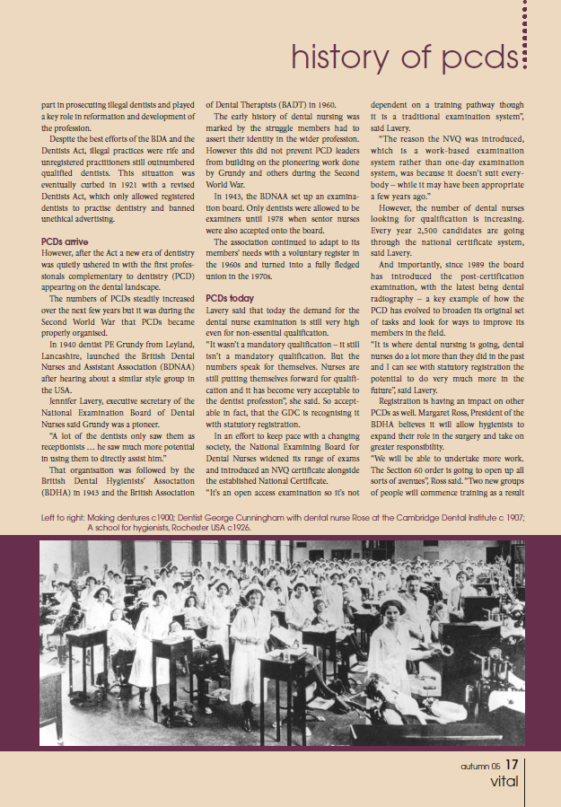 Known to many, Jennifer Lavery was influential, along with others, in registration and the changes to dental nurse education, a particular article in which we must acknowledge Vital ” history of pcds: The rise and rise of PCDs” by Sell, C. 2005, tells you much of what you need to know.